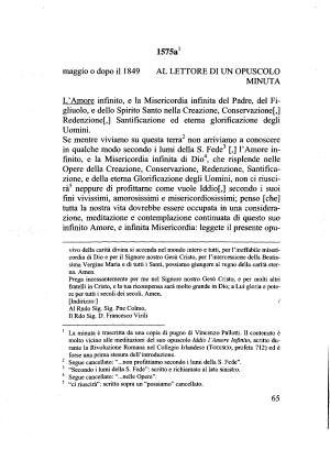 1 La minuta è trascritta da una copia di pugno di Vincenzo Pallotti . Il contenuto è molto vicino alle meditazioni del suo opuscolo Iddio V Amore Infinito , scritto durante la Rivoluzione Romana nel Collegio Irlandese ( Tooisco , profeta 712 ) ed è forse una prima stesura dell ’ introduzione .
