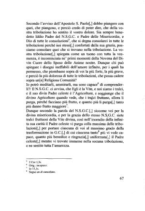 Dunque secondo la parola del N . S . G . C .[,] siccome voi per la divina misericordia , e per la grazia dello stesso N . S . G . C . siete tralci fruttuosi della Vite divina , così nell ’ incendio della infinita sua carità il Padre celeste vi purga colla massima delle tribolazioni [,] per portare ciascuna di voi al massimo grado della trasformazione in G . C .[,] di cui ciascuna tanto8 più vi vede capace , quanto più benedice e ringraziaf ,] uniformata [,] il Padre celeste [,] mentre vi trovate immerse nella somma tribolazione , e ne sentite tutta l ’ amarezza .