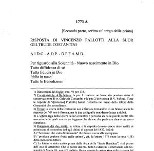 1 ) Dimensioni del foglio : mm . 96 per 134 . 2 ) Caratteristiche della lettera : la pnc 1 contiene un brano ( in pessimo stato di conservazione ) di sr . Geltrude Costantini e la pnc 2 la risposta di V . Pallotti . Tutte le risposte di Vincenzo ] P [ allotti ] hanno riscontro nel brano della lettera della