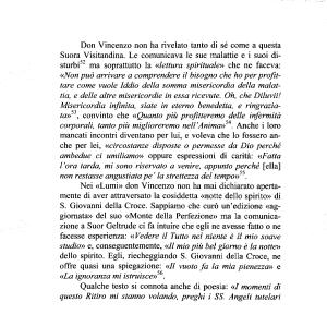 Nei « Lumi » don Vincenzo non ha mai dichiarato apertamente di aver attraversato la cosiddetta « notte dello spirito » di S . Giovanni della Croce . Sappiamo che curò un ’ edizione « aggiornata » del suo « Monte della Perfezione » ma la comunicazione a Suor Geltrude ci fa intuire che egli ne avesse fatto o ne facesse esperienza : « Vedere il Tutto nel niente è il mio soave studio » e , conseguentemente , « Il mio più bel giorno è la notte » dello spirito . Egli , riecheggiando S . Giovanni della Croce , ne