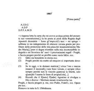 Apostoli dicendole = Sono gl ’ impicci (!) tuoi - mi spiego = sebbene io sia indegnissimo di ottenere veruna grazia per profittare della protezione delle mia piucché innamoratissima Madre Maria [,] pure si degna trionfare sulla mia inconcepibile indegnità e mi favorisce de ’ suoi +) preziosissimi regali - Preghi , e faccia pregare perché ne profitti come vuole Iddio , ecc . ( 1 ) Iddio sia benedetto in eterno ecc . ( 2 ) Preghi perché sia esatto ad eseguire si importante dovere .