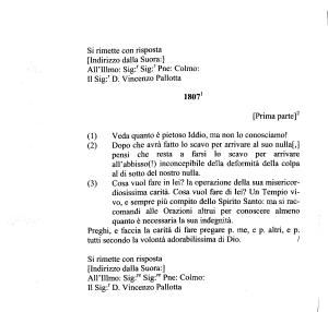 ( 1 ) Veda quanto è pietoso Iddio , ma non lo conosciamo ! ( 2 ) Dopo che avrà fatto Io scavo per arrivare al suo nulla [,] pensi che resta a farsi lo scavo per arrivare all ’ abbisso (!) inconcepibile della deformità della colpa al di sotto del nostro nulla . ( 3 ) Cosa vuol fare in lei ? la operazione della sua misericordiosissima carità . Cosa vuol fare di lei ? Un Tempio vivo , e sempre più compito dello Spirito Santo : ma si raccomandi alle Orazioni altrui per conoscere almeno quanto è necessaria la sua indegnità . Preghi , e faccia la carità di fare pregare p . me , e p . altri , e p . tutti secondo la volontà adorabilissima di Dio . /