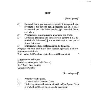 ( 1 ) Domandi lume per conoscere quanto è indegna di apprendere il più perfetto della perfezione dei SS . Voti , e lo domandi per la D . Misericordia [,] p . i meriti di Gesù , e di Maria . ( 2 ) Preghiamo p . la disposizione a parlarne con frutto . ( 3 ) Domenica prossima alla sera spero di entrare in SS . E- sercizi alla Missione 123 [;] non so cosa sarà di me per la