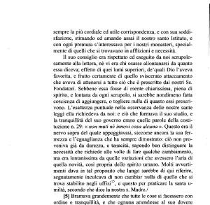 Il suo consiglio era rispettato ed eseguito da noi scrupolosamente alla lettera , nè vi era chi osasse allontanarsi da quanto essa diceva ; effetto di quei lumi superiori , de ’ quali Dio l ’ aveva favorita , e frutto certamente di quello sviscerato attaccamento che aveva di attenersi a tutto ciò che è prescritto dai nostri Ss . Fondatori . Sebbene essa fosse di mente chiarissima , piena di spirito , e lontana da ogni scrupolo , si sarebbe nondimeno fatta coscienza di aggiungere , o togliere nulla di quanto essi prescrivono . L ’ esattezza puntuale nella osservanza delle nostre sante leggi ella richiedeva da noi : e ciò che formava il suo studio , e la tranquillità del suo governo erano quelle parole della costituzione n . 29 : « non muti nè innovi cosa alcuna ». Questo era il nervo sopra del quale appoggi avasi , siccome ancora la sua fermezza e l ’ eguaglianza che ha sempre dimostrato : ciò non proveniva già da durezza , e tenacità , sapendo ben distinguere la necessità che richiede alle volte di fare qualche cambiamento , ma era lontanissima da quelle variazioni che avessero l ’ aria di quella novità , così propria dello spirito umano . Molti avvertimenti dava in tal proposito che lungo sarebbe di qui riferire , segnatamente inculcava di non cambiar nulla di quello che si trova stabilito negli uffizi15 , e questo per praticare la santa u-