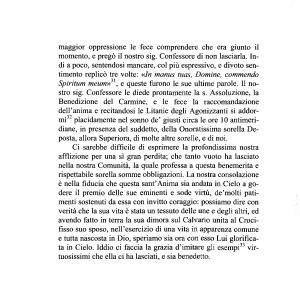 dell ’ anima e recitandosi le Litanie degli Agonizzanti si addormì31 32 placidamente nel sonno de ’ giusti circa le ore 10 antimeridiane , in presenza del suddetto , della Onoratissima sorella Deposta , allora Superiora , di molte altre sorelle , e di noi .