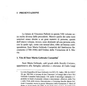 Le lettere di Vincenzo Pallotti in questo Vili volume sono molto diverse dalle precedenti . Mentre quelle dei sette tomi anteriori erano dirette a un gran numero di persone , queste dell ’ ottavo volume , invece , sono destinate ad una persona sola , con la quale egli , come con nessun ’ altra , ebbe un ’ intensa corrispondenza : Suor Maria Geltrude Costantini del Santissimo Sacramento ( 1780-1846 ) dell ’ ordine della Visitazione di S . Maria .