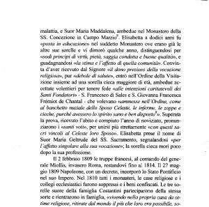 « posta in educazione » nel suddetto Monastero ove erano già le altre sue sorelle e vi dimorò qualche anno , distinguendosi per « sodi principi di virtù , pietà , saggia condotta e buone qualità », e guadagnandosi « la stima e l ’ affetto di quella comunità ». Convinta d ’ aver ricevuto dal Signore « il dono prezioso della vocazione religiosa », pur « debole di salute », entrò nell ’ Ordine della Visitazione insieme ad una sorella cieca maggiore di età , ambedue accettate volentieri per tenere fede « alle intenzioni caritatevoli dei