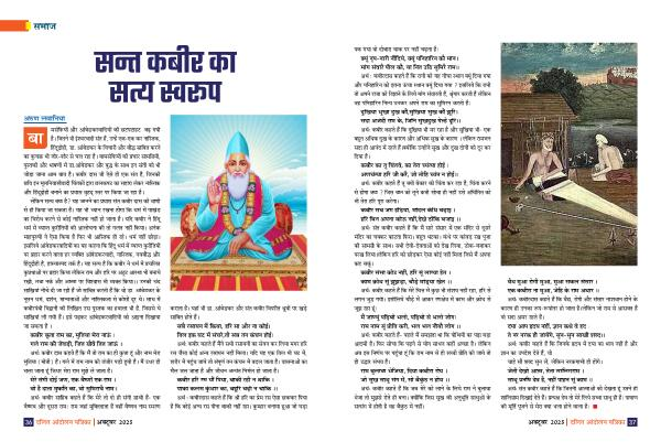 मसदेतफयों और आंबदे््र्वादियों की छटपटाहट बढ़ गयी है । जितनदे भी ईश्वर्वादी संत हैं, उनहें एक-एक कर नाशसत्, हिंदूद्रोही, डा. आंबदे््र के त्वचारों और बौद्ध साबित करनदे का कुचरि भी जोर-शोर सदे चल रहा है । बामसदेतफयों की प्रचार सामग्रियों, पुसत्ों और भाषणों में डा. आंबदे््र और बुद्ध के साथ इन संतों को भी जोड़ा जाना आम बात है । कबीर दास जी ऐसदे ही एक संत हैं, जिनकी छत्व इन मूलतन्वासी्वादी चिंतकों द्ारा छलकपट का सहारा लदे्र नाशसत् और हिंदूद्रोही बनानदे का प्रयास ्वृहद् सतर पर किया जा रहा है ।