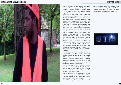 Social Therapy: Miryda Black, how long have you been singing and what got you started? Miryda Black: I have been singing since I was 5. My mother was a big influence because she involved me with the church choir. Social Therapy: Who were some of your other influences? Miryda Black: Well of course my mother but then there’s Michael Jackson, Sam Cooke, The Temptations and The Isley Brothers but we could keep the list going. Social Therapy: Are you signed and if not who would you sign with? Miryda Black: No, I am not signed, but if I had the choice I would love to do music with Lupe Fiasco.