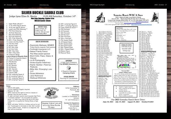 SILVER BUCKLE SADDLE CLUB Judge Lynn Ellen St . Martin 10:00 AM Saturday , October 14 th Rain Date : Saturday , October 21st WSCA Game Show