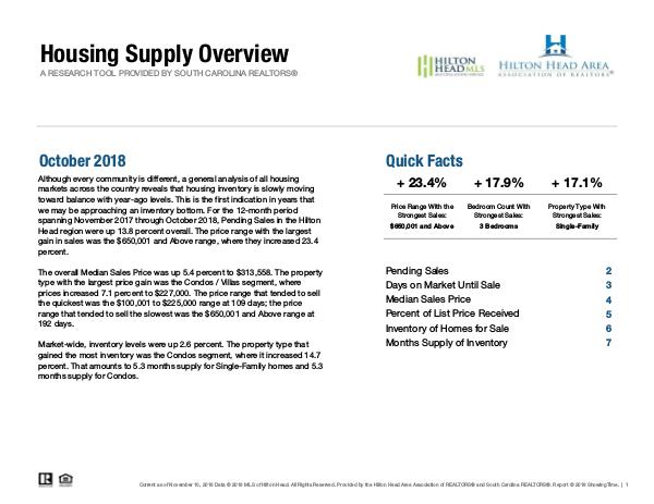 Current as of November 10, 2018 Data © 2018 MLS of Hilton Head. All Rights Reserved. Provided by the Hilton Head Area Association of REALTORS® and South Carolina REALTORS®. Report © 2018 ShowingTime. | 1