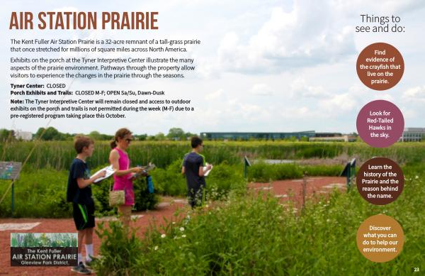 Exhibits on the porch at the Tyner Interpretive Center illustrate the many aspects of the prairie environment . Pathways through the property allow visitors to experience the changes in the prairie through the seasons .