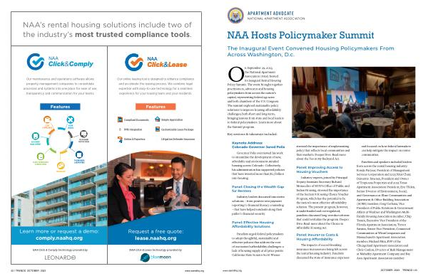 On September 29 , 2023 , the National Apartment Association ( NAA ) hosted its inaugural Rental Housing Policy Summit . The event brought together practitioners , advocates and housing policymakers from across the nation ’ s capital , representing federal agencies and both chambers of the U . S . Congress . The summit explored sustainable policy solutions to improve housing affordability challenges , both short and long-term , bringing lessons from state and local leaders to federal policymakers . Learn more about the Summit program .