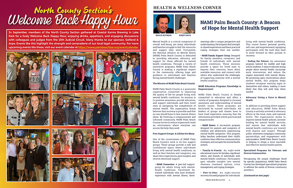 In September, members of the North County Section gathered at Coastal Karma Brewing in Lake Park for a lively Welcome Back Happy Hour, enjoying drinks, appetizers, and engaging discussions with colleagues and judges from the 15th Judicial Circuit. Many thanks to our sponsor, Gelfand & Arpe. Events like this highlight the strength and camaraderie of our local legal community. For more upcoming events like these, visit our event calendar at https:// www. palmbeachbar. org / eventcalendar.