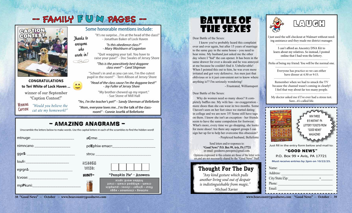 Just fill in the entry form below and mail to:“ GOOD NEWS” P. O. Box 99 • Avis, PA 17721 Must receive entries by 2pm on 10 / 22 / 25.