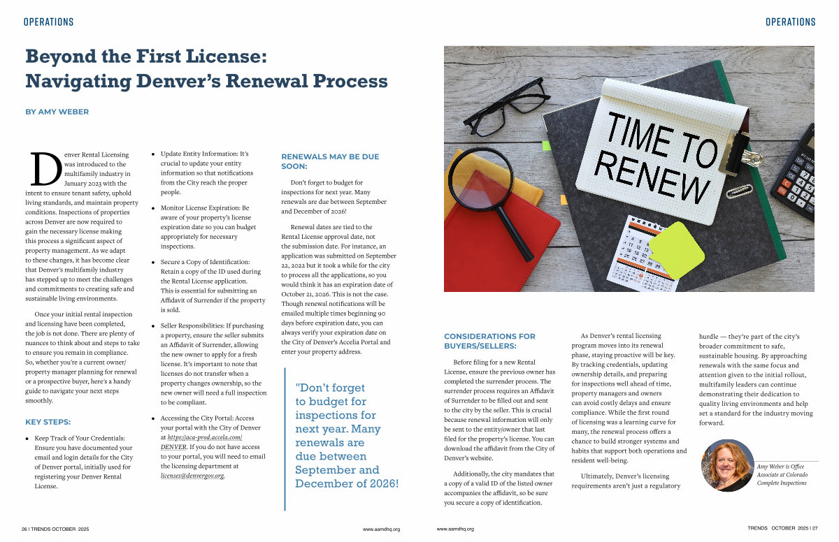 Ultimately, Denver’ s licensing requirements aren’ t just a regulatory hurdle— they’ re part of the city’ s broader commitment to safe, sustainable housing. By approaching renewals with the same focus and attention given to the initial rollout, multifamily leaders can continue demonstrating their dedication to quality living environments and help set a standard for the industry moving forward.