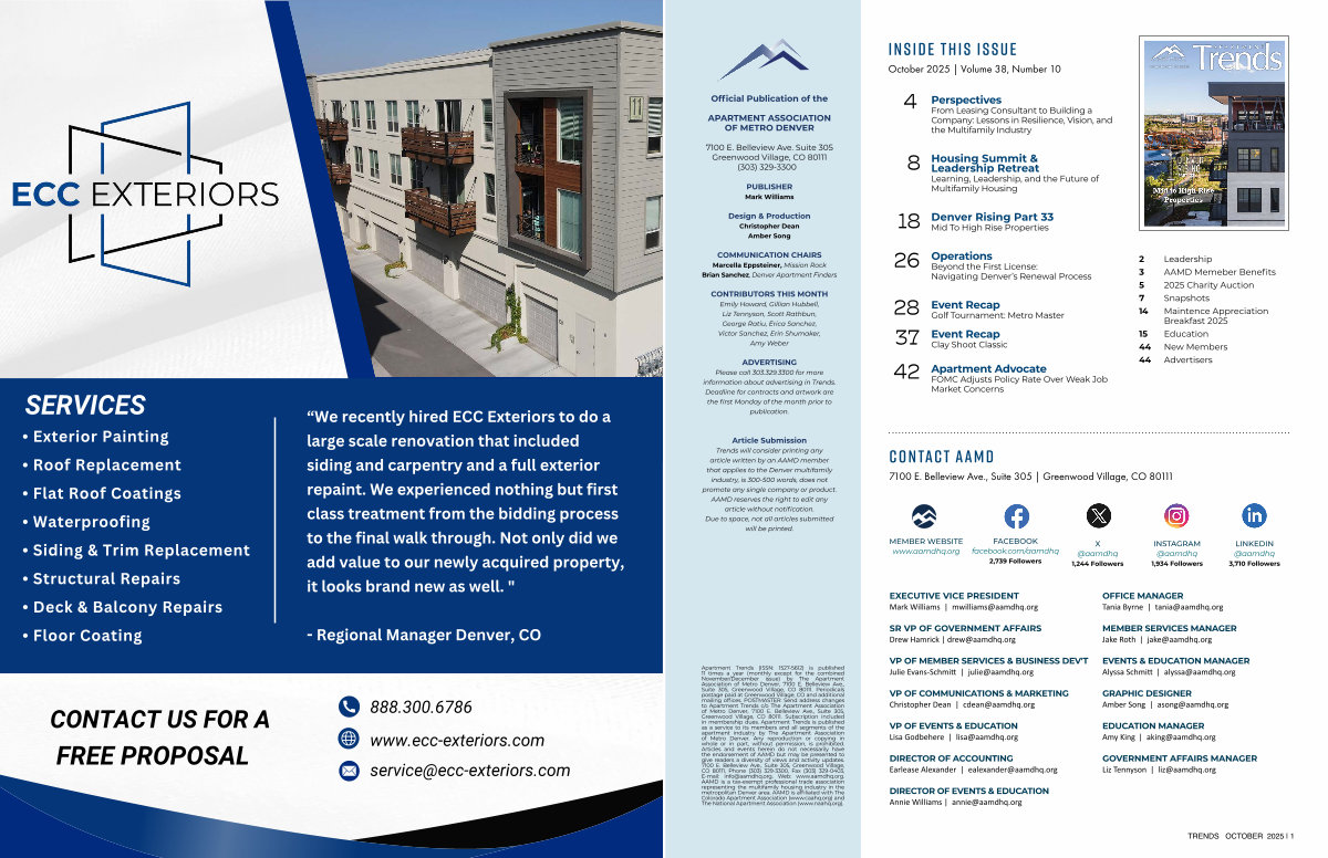 Apartment Trends( ISSN: 1527-5612) is published 11 times a year( monthly except for the combined November / December issue) by The Apartment Association of Metro Denver, 7100 E. Belleview Ave., Suite 305, Greenwood Village, CO 80111. Periodicals postage paid at Greenwood Village, CO and additional mailing offices. POSTMASTER: Send address changes to Apartment Trends c / o The Apartment Association of Metro Denver, 7100 E. Belleview Ave., Suite 305, Greenwood Village, CO 80111. Subscription included in membership dues. Apartment Trends is published as a service to its members and all segments of the apartment industry by The Apartment Association of Metro Denver. Any reproduction or copying in whole or in part, without permission, is prohibited. Articles and events herein do not necessarily have the endorsement of AAMD but may be presented to give readers a diversity of views and activity updates. 7100 E. Belleview Ave., Suite 305, Greenwood Village, CO 80111, Phone( 303) 329-3300, Fax( 303) 329-0403, E-mail: info @ aamdhq. org, Web: www. aamdhq. org. AAMD is a tax-exempt professional trade association representing the multifamily housing industry in the metropolitan Denver area. AAMD is affiliated with The Colorado Apartment Association( www. caahq. org) and The National Apartment Association( www. naahq. org).