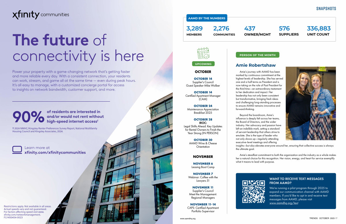 We ' re running a pilot program through 2025 to expand our communication channel with AAMD members. If you ' d like to opt in and receive text messages from AAMD, please visit www. aamdhq. org / text www. aamdhq. org TRENDS OCTOBER 2025 | 7