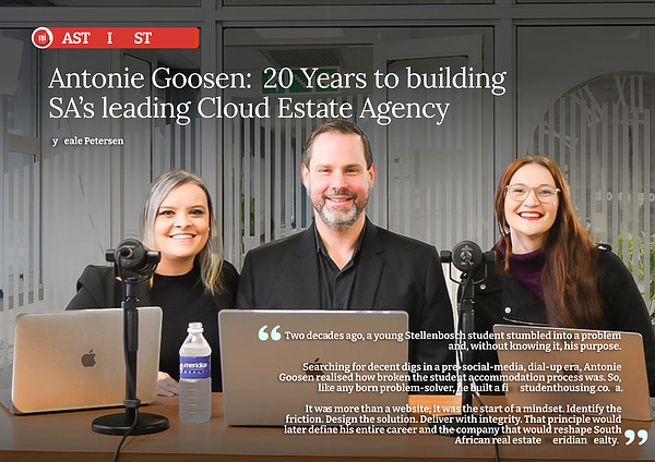 Inside this issue, we go straight to what matters. Our cover feature sits down with CEO Antonie Goosen on Meridian Realty’ s 20-year journey, how to scale, lead and stay human in a digital market. We launch a new five-part series, The Power of the Auction, with Prof Adrian Saville and Ian Macleod unpacking why auction markets price risk faster and how savvy investors can use that edge.