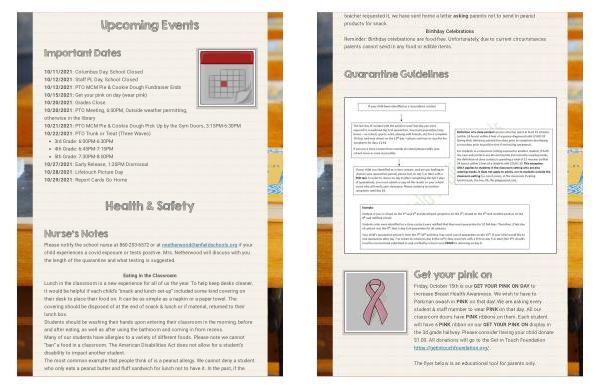 Friday , October 15th is our GET YOUR PINK ON DAY to increase Breast Health Awareness . We wish to have to Parkman awash in PINK on that day ! We are asking every student & staff member to wear PINK on that day . All our classroom doors have PINK ribbons on them . Each student will have a PINK ribbon on our GET YOUR PINK ON display in the 3d grade hallway . Please consider having your child donate $ 1.00 . All donations will go to the Get in Touch Foundation https :// getintouchfoundation . org / .
