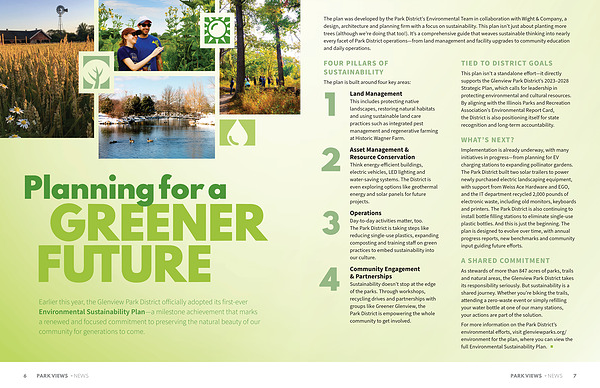 For more information on the Park District’ s environmental efforts, visit glenviewparks. org / environment for the plan, where you can view the full Environmental Sustainability Plan. ▪