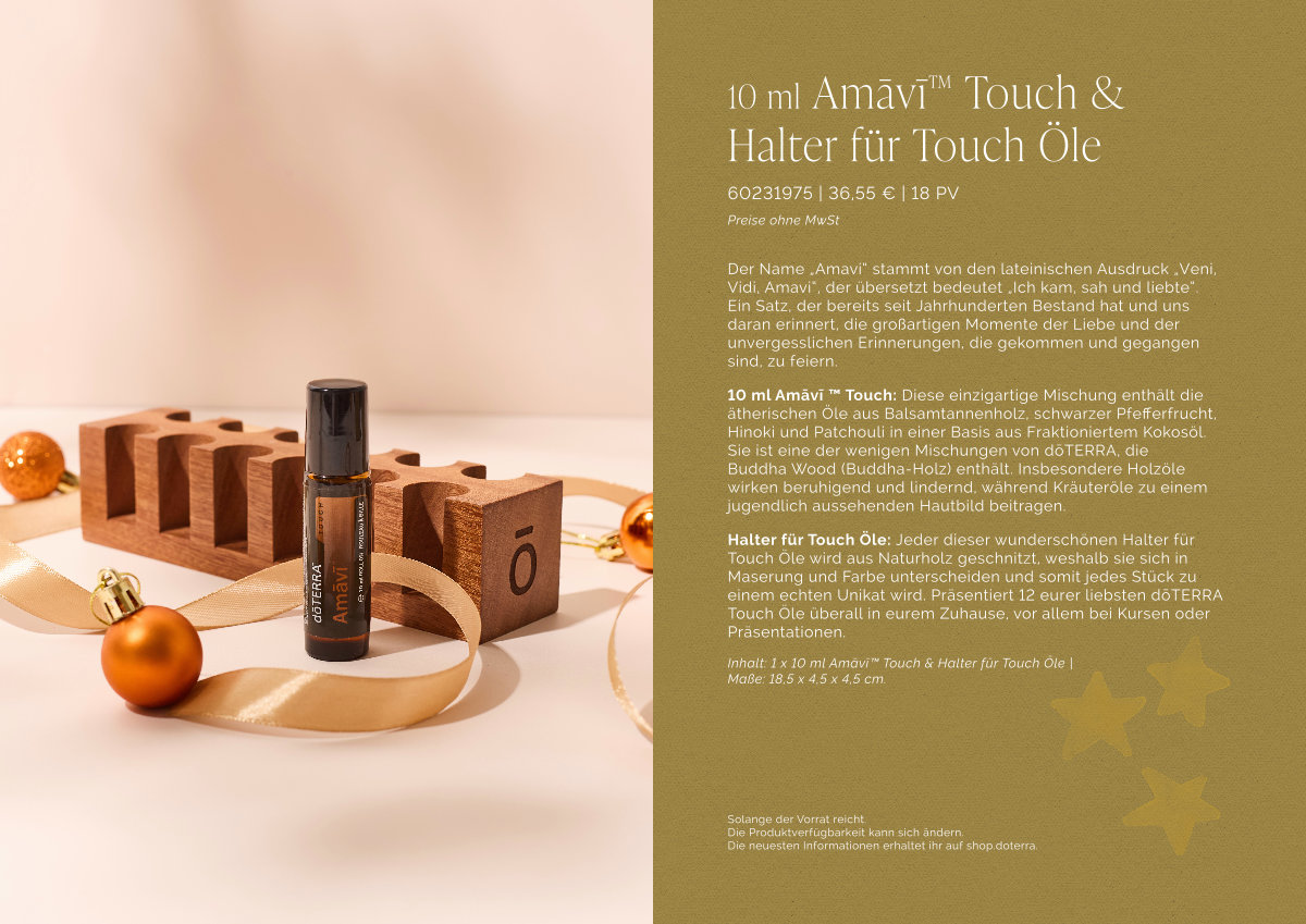 10 ml Amāvī ™ Touch: Diese einzigartige Mischung enthält die ätherischen Öle aus Balsamtannenholz, schwarzer Pfefferfrucht, Hinoki und Patchouli in einer Basis aus Fraktioniertem Kokosöl. Sie ist eine der wenigen Mischungen von dō̄TERRA, die Buddha Wood( Buddha-Holz) enthält. Insbesondere Holzöle wirken beruhigend und lindernd, während Kräuteröle zu einem jugendlich aussehenden Hautbild beitragen.