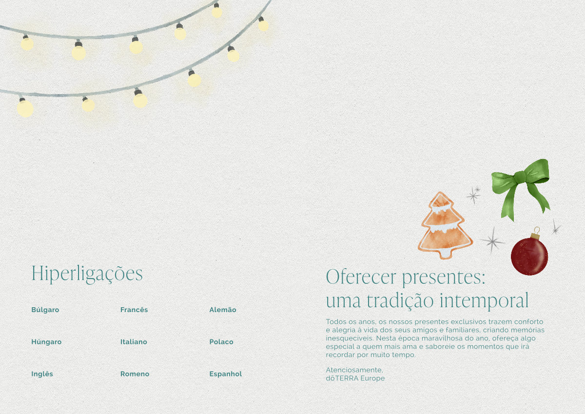 Todos os anos, os nossos presentes exclusivos trazem conforto e alegria à vida dos seus amigos e familiares, criando memórias inesquecíveis. Nesta época maravilhosa do ano, ofereça algo especial a quem mais ama e saboreie os momentos que irá recordar por muito tempo.