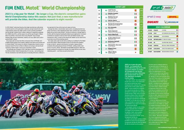 In 2023 , MotoE™ welcomes Ducati as the single manufacturer , with plenty to look forward to as the grid switch machinery and get ready for the most comprehensive season ever . Eight rounds in seven countries saw MotoE™ join the MotoGP™ paddock from Le Mans , kicking off competition alongside the 1000th Grand Prix , and the season runs all the way through to Misano World Circuit Marco Simoncelli . That ’ s every MotoGP™ stop in Europe between May and early September , creating a 16-race , eight-round , actionpacked MotoE™ season . Every team will now have two bikes as Dynavolt Intact GP MotoE™ and Ongetta SIC58 Squadra Corse expand , making it nine teams and 18 riders set to contest MotoE™ ’ s first season as a World Championship . Present at every European Grand Prix from Le Mans to Misano and racing on all-new Ducati machinery , MotoE™ begins a new era of competition in 2023 . The timetable also changes in 2023 . Saturday is now the showstopper for the FIM Enel MotoE™ World Championship . It ’ s race day – and nothing else ! The two showdowns now both take place on Saturday afternoon , making it a true spectacle for fans at the track and viewers at home . Amongst the riders , some familiar names return , including two-time Cup winner Jordi Torres , now at Openbank Aspar Team , and first ever Cup winner Matteo Ferrari ( Felo Gresini MotoE™ ). The pair are locked in a vintage fight for the title , with the Spaniard leading the Italian by just eight points . Consistent contender Eric Granado is back at LCR E-Team and Mattia Casadei , a key protagonist in 2022 , remains at Pons Racing 40 . Neither can be ruled out for a race win at any of the remaining rounds . The rookie ranks make for interesting reading too , headlined by Tito Rabat as the 2014 Moto2™ World Champion returns to the Grand Prix paddock to take on MotoE™ . Randy Krummenacher is already a regular podium contender after joining Dynavolt Intact GP MotoE™ , adding another class to his CV of 125cc , Moto2™ , WorldSSP and WorldSBK experience . With new Ducati machinery for everyone on the grid , the rookies will be an even more interesting watch – and there are plenty fresh faces !
