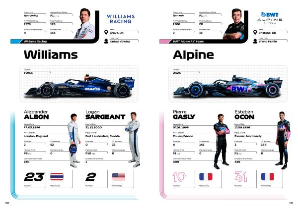 Pierre G A S LY Esteban OCON Base Enstone , UK Team Chief Bruno Famin Alpine BWT Alpine F1 ® Team Power Unit Renault First Team Entry 1986 World Championships 2 Highest Race Finish P1 ( X21 ) Pole Positions 20 Fastest Laps 15 Date of Birth 07.02.1996 Place of birth Rouen , France Podiums 4 Highest finish P1 ( X1 ) GP entered 141 Championships 0 Championship Points 400 Date of Birth 17.09.1996 Place of birth Évreux , Normandy Podiums 3 Highest finish P1 ( X1 ) GP entered 144 Championships 0 Championship Points 425 Chassis A524 Number Number Nationality Nationality 109