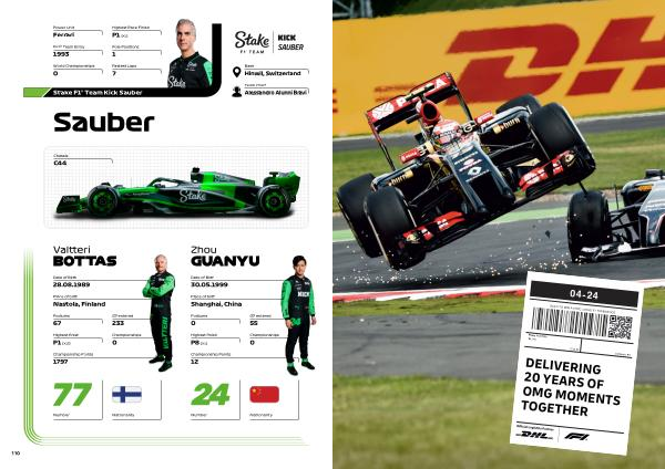 Valtteri BOTTAS Zhou GUANYU Base Hinwil , Switzerland Team Chief Alessandro Alunni Bravi Sauber Stake F1 ® Team Kick Sauber Power Unit Ferrari First Team Entry 1993 World Championships 0 Highest Race Finish P1 ( X1 ) Pole Positions 1 Fastest Laps 7 Date of Birth 28.08.1989 Place of birth Nastola , Finland Podiums 67 Highest finish P1 ( X10 ) GP entered 233 Championships 0 Championship Points 1797 Date of Birth 30.05.1999 Place of birth Shanghai , China Podiums 0 Highest finish P8 ( X1 ) GP entered 55 Championships 0 Championship Points 12 Chassis C44 Number Number Nationality Nationality 110