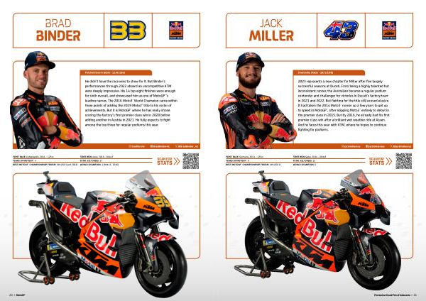 He didn ’ t have the race wins to show for it . But Binder ’ s performances through 2022 aboard an uncompetitive KTM were deeply impressive . His 14 top eight finishes were enough for sixth overall , and showcased him as one of MotoGP™ ’ s leading names . The 2016 Moto3™ World Champion came within three points of adding the 2019 Moto2™ title to his roster of achievements . But it is MotoGP™ where he has really shone , scoring the factory ’ s first premier class win in 2020 before adding another in Austria in 2021 . He fully expects to fight among the top three for regular podiums this year .