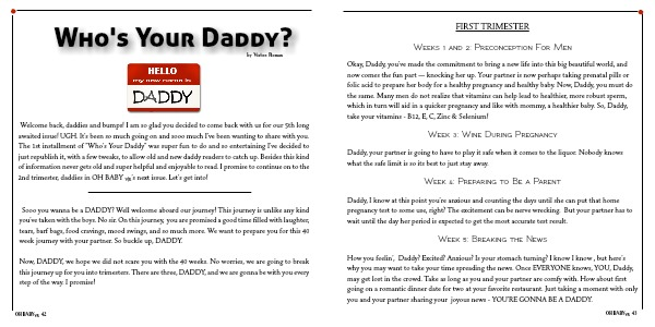 Okay, Daddy, you've made the commitment to bring a new life into this big beautiful world, and now comes the fun part — knocking her up. Your partner is now perhaps taking prenatal pills or folic acid to prepare her body for a healthy pregnancy and healthy baby. Now, Daddy, you must do the same. Many men do not realize that vitamins can help lead to healthier, more robust sperm, which in turn will aid in a quicker pregnancy and like with mommy, a healthier baby. So, Daddy, take your vitamins - B12, E, C, Zinc & Selenium!