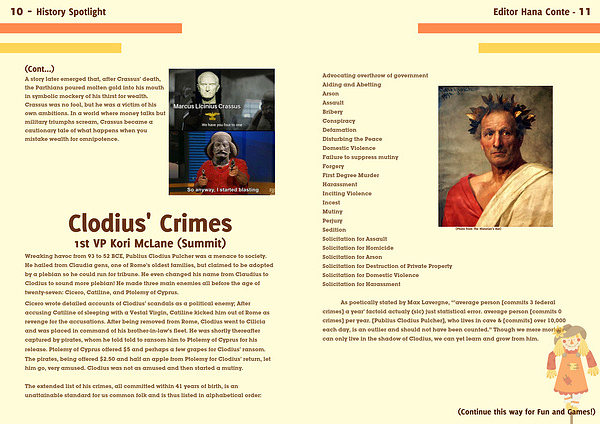 Wreaking havoc from 93 to 52 BCE, Publius Clodius Pulcher was a menace to society. He hailed from Claudia gens, one of Rome's oldest families, but claimed to be adopted by a plebian so he could run for tribune. He even changed his name from Claudius to Clodius to sound more plebian! He made three main enemies all before the age of twenty-seven: Cicero, Catiline, and Ptolemy of Cyprus.