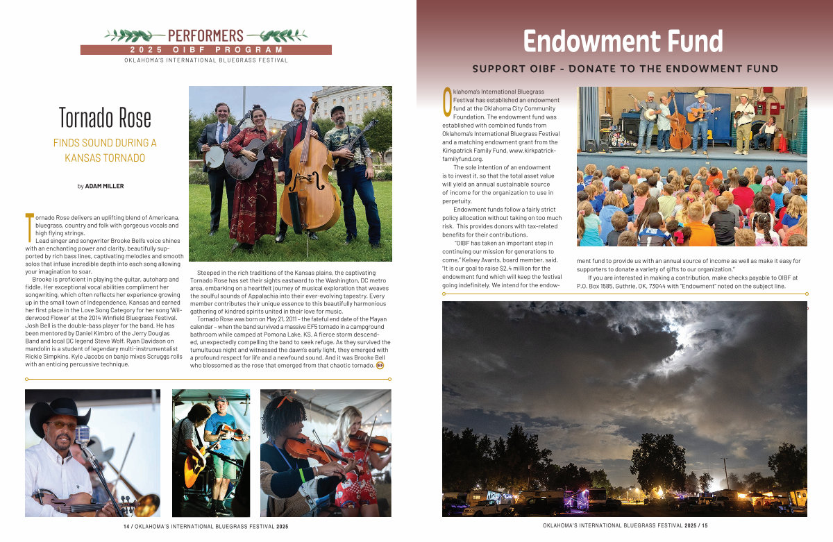 Oklahoma’ s International Bluegrass Festival has established an endowment fund at the Oklahoma City Community Foundation. The endowment fund was established with combined funds from Oklahoma’ s International Bluegrass Festival and a matching endowment grant from the Kirkpatrick Family Fund, www. kirkpatrickfamilyfund. org.