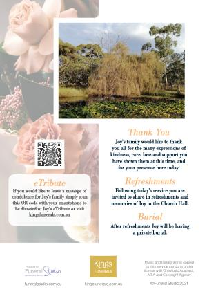 eTribute If you would like to leave a message of condolence for Joy ’ s family simply scan this QR code with your smartphone to be directed to Joy ’ s eTribute or visit kingsfunerals . com . au