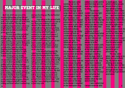 I saw what had happen! My right leg was shredded into little pieces just hanging there by a little piece of skin, there was bone sticking out everywhere and lots of blood. My left leg was still there but there was two bones sticking out of my knee. I had no knee cap anymore it was sliced off completely. My dad ran to get my mom and to call 911. My dad came back and then he started to talk to me to keep me awake and calm. “Madison I think that you’re going to lose one of your legs,” said my dad. I was shaking and starting to feel very cold.