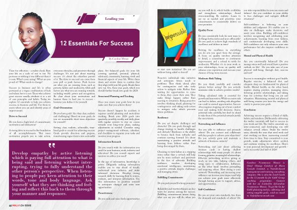 Achieving success requires a blend of skills , habits , and mindsets . Deliberately cultivating the twelve essentials will lead to success in your work and life . The twelve essentials are inter-connected , and developing one will enhance several others . Study the twelve areas , identify the ones that need work and start working on them , reassessing yourself from time to time . Stay committed to your growth , make adjustments where needed , and continue striving for excellence . Here ’ s to your personal development and growth - and a successful 2nd half of 2024 !