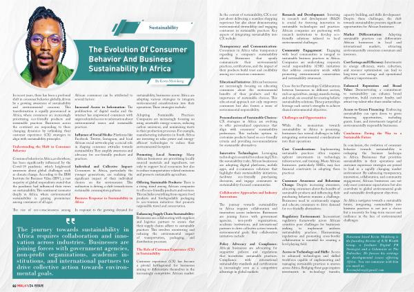 In conclusion , the evolution of consumer behavior towards sustainability is reshaping the business landscape in Africa . Businesses that prioritize sustainability in their operations and customer experience strategies are poised to lead in a rapidly changing market environment . By embracing transparency , innovation , collaboration , and community engagement , African businesses can not only meet consumer expectations but also contribute to global environmental goals and sustainable development objectives .