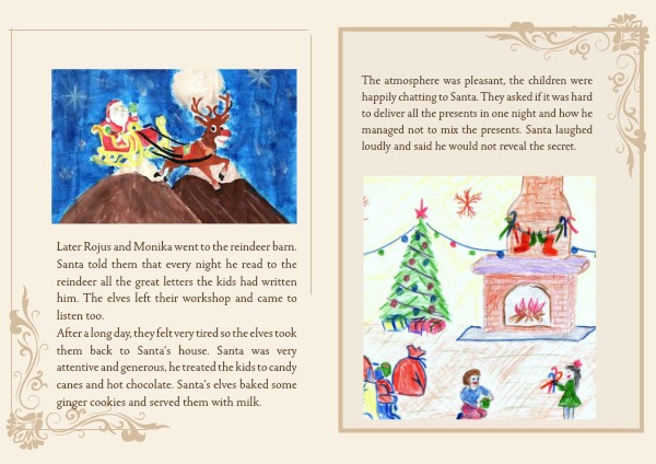 Later Rojus and Monika went to the reindeer barn. Santa told them that every night he read to the reindeer all the great letters the kids had written him. The elves left their workshop and came to listen too.
