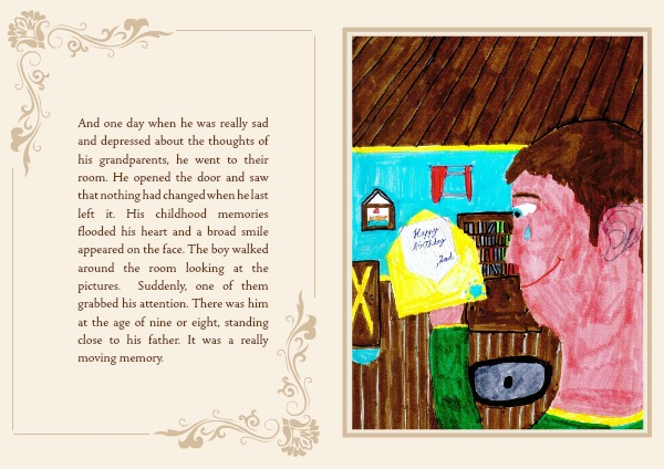 And one day when he was really sad and depressed about the thoughts of his grandparents, he went to their room. He opened the door and saw that nothing had changed when he last left it. His childhood memories flooded his heart and a broad smile appeared on the face. The boy walked around the room looking at the pictures. Suddenly, one of them grabbed his attention. There was him at the age of nine or eight, standing close to his father. It was a really moving memory.