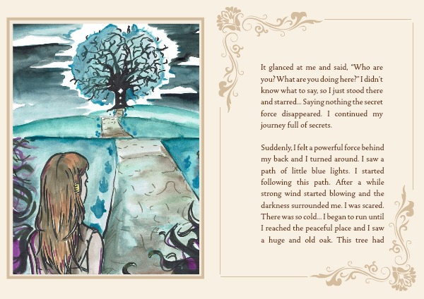 Suddenly, I felt a powerful force behind my back and I turned around. I saw a path of little blue lights. I started following this path. After a while strong wind started blowing and the darkness surrounded me. I was scared. There was so cold… I began to run until I reached the peaceful place and I saw a huge and old oak. This tree had