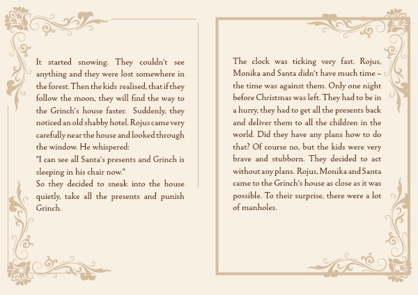 The clock was ticking very fast. Rojus, Monika and Santa didn‘t have much time – the time was against them. Only one night before Christmas was left. They had to be in a hurry, they had to get all the presents back and deliver them to all the children in the world. Did they have any plans how to do that? Of course no, but the kids were very brave and stubborn. They decided to act without any plans. Rojus, Monika and Santa came to the Grinch‘s house as close as it was possible. To their surprise, there were a lot of manholes.