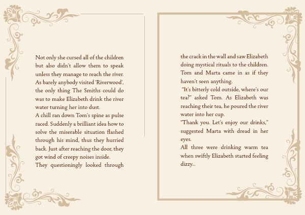 “It’s bitterly cold outside, where’s our tea?” asked Tom. As Elizabeth was reaching their tea, he poured the river water into her cup.