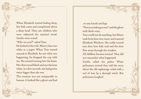 He looked at his wife. Marta’s face was white as a paper. When Tom turned around to Elizabeth, he saw what was happening, he dropped the cup with tea. She started turning into the beast. Her skin turned black and eyes became white. In a few seconds, she had grown twice bigger than she was.