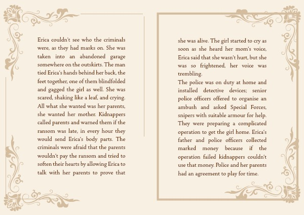 The police was on duty at home and installed detective devices; senior police officers offered to organise an ambush and asked Special Forces, snipers with suitable armour for help. They were preparing a complicated operation to get the girl home. Erica‘s father and police officers collected marked money because if the operation failed kidnappers couldn‘t use that money. Police and her parents had an agreement to play for time.