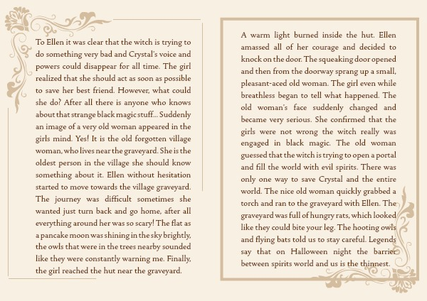 A warm light burned inside the hut. Ellen amassed all of her courage and decided to knock on the door. The squeaking door opened and then from the doorway sprang up a small, pleasant-aced old woman. The girl even while breathless began to tell what happened. The old woman’s face suddenly changed and became very serious. She confirmed that the girls were not wrong the witch really was engaged in black magic. The old woman guessed that the witch is trying to open a portal and fill the world with evil spirits. There was only one way to save Crystal and the entire world. The nice old woman quickly grabbed a torch and ran to the graveyard with Ellen. The graveyard was full of hungry rats, which looked like they could bite your leg. The hooting owls and flying bats told us to stay careful. Legends say that on Halloween night the barrier between spirits world and us is the thinnest.