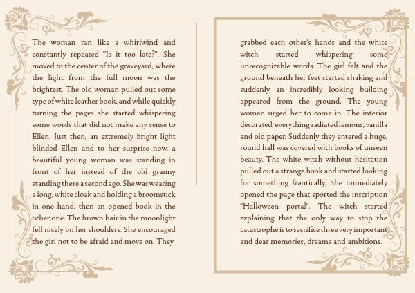 The woman ran like a whirlwind and constantly repeated ββIs it too late?ββ. She moved to the center of the graveyard, where the light from the full moon was the brightest. The old woman pulled out some type of white leather book, and while quickly turning the pages she started whispering some words that did not make any sense to Ellen. Just then, an extremely bright light blinded Ellen and to her surprise now, a beautiful young woman was standing in front of her instead of the old granny standing there a second ago. She was wearing a long, white cloak and holding a broomstick in one hand, then an opened book in the other one. The brown hair in the moonlight fell nicely on her shoulders. She encouraged the girl not to be afraid and move on. They