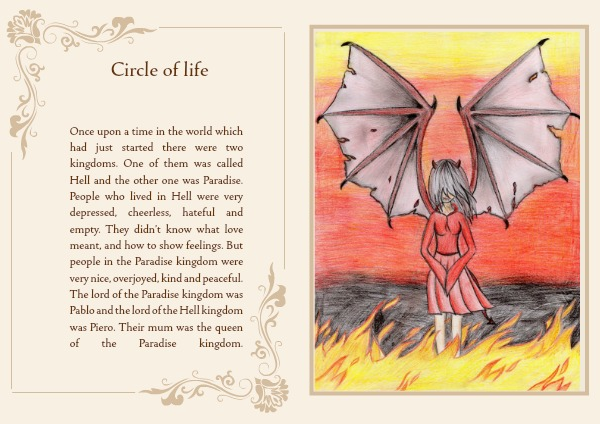 Once upon a time in the world which had just started there were two kingdoms. One of them was called Hell and the other one was Paradise. People who lived in Hell were very depressed, cheerless, hateful and empty. They didn’t know what love meant, and how to show feelings. But people in the Paradise kingdom were very nice, overjoyed, kind and peaceful. The lord of the Paradise kingdom was Pablo and the lord of the Hell kingdom was Piero. Their mum was the queen of the Paradise kingdom.