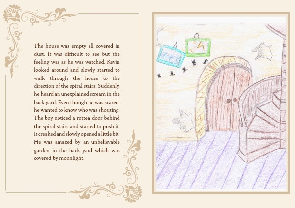 The house was empty all covered in dust. It was difficult to see but the feeling was as he was watched. Kevin looked around and slowly started to walk through the house to the direction of the spiral stairs. Suddenly, he heard an unexplained scream in the back yard. Even though he was scared, he wanted to know who was shouting. The boy noticed a rotten door behind the spiral stairs and started to push it. It creaked and slowly opened a little bit. He was amazed by an unbelievable garden in the back yard which was covered by moonlight.