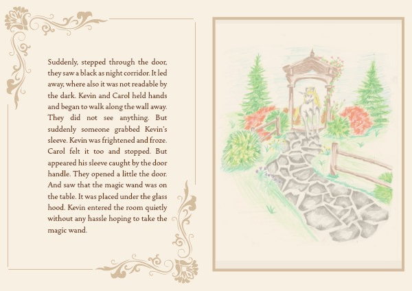 Suddenly, stepped through the door, they saw a black as night corridor. It led away, where also it was not readable by the dark. Kevin and Carol held hands and began to walk along the wall away. They did not see anything. But suddenly someone grabbed Kevin's sleeve. Kevin was frightened and froze. Carol felt it too and stopped. But appeared his sleeve caught by the door handle. They opened a little the door. And saw that the magic wand was on the table. It was placed under the glass hood. Kevin entered the room quietly without any hassle hoping to take the magic wand.